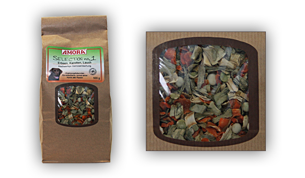 | Fütterungsempfehlung: Der Tagesbedarf variiert durch Faktoren wie Alter, Temperament, Gesundheitszustand und Aktivität und sollte darauf abgestimmt werden. 1g Trockengemüse entspricht ca. 10g frischer Ware. Fütterungsempfehlung durchschnittlicher Hund 20kg: Benötigt zur Fleischration ca. 8 - 10g AMORA Gemüsemischung am Tag. | ||