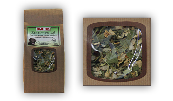 | Fütterungsempfehlung: Der Tagesbedarf variiert durch Faktoren wie Alter, Temperament, Gesundheitszustand und Aktivität und sollte darauf abgestimmt werden. 1g Trockengemüse entspricht ca. 10g frischer Ware. Fütterungsempfehlung durchschnittlicher Hund 20kg: Benötigt zur Fleischration ca. 8 - 10g AMORA Gemüsemischung am Tag. | ||