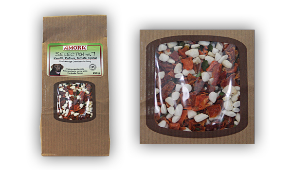 | Fütterungsempfehlung: Der Tagesbedarf variiert durch Faktoren wie Alter, Temperament, Gesundheitszustand und Aktivität und sollte darauf abgestimmt werden. 1g Trockengemüse entspricht ca. 10g frischer Ware. Fütterungsempfehlung durchschnittlicher Hund 20kg: Benötigt zur Fleischration ca. 8 - 10g AMORA Gemüsemischung am Tag. | ||