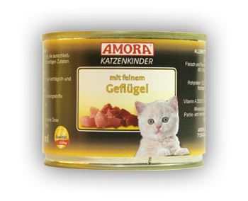 | Fütterungsempfehlung: Eine junge kleine Katze benötigt etwa eine Dose AMORA FLEISCH PUR KATZENKINDER am Tag. | ||